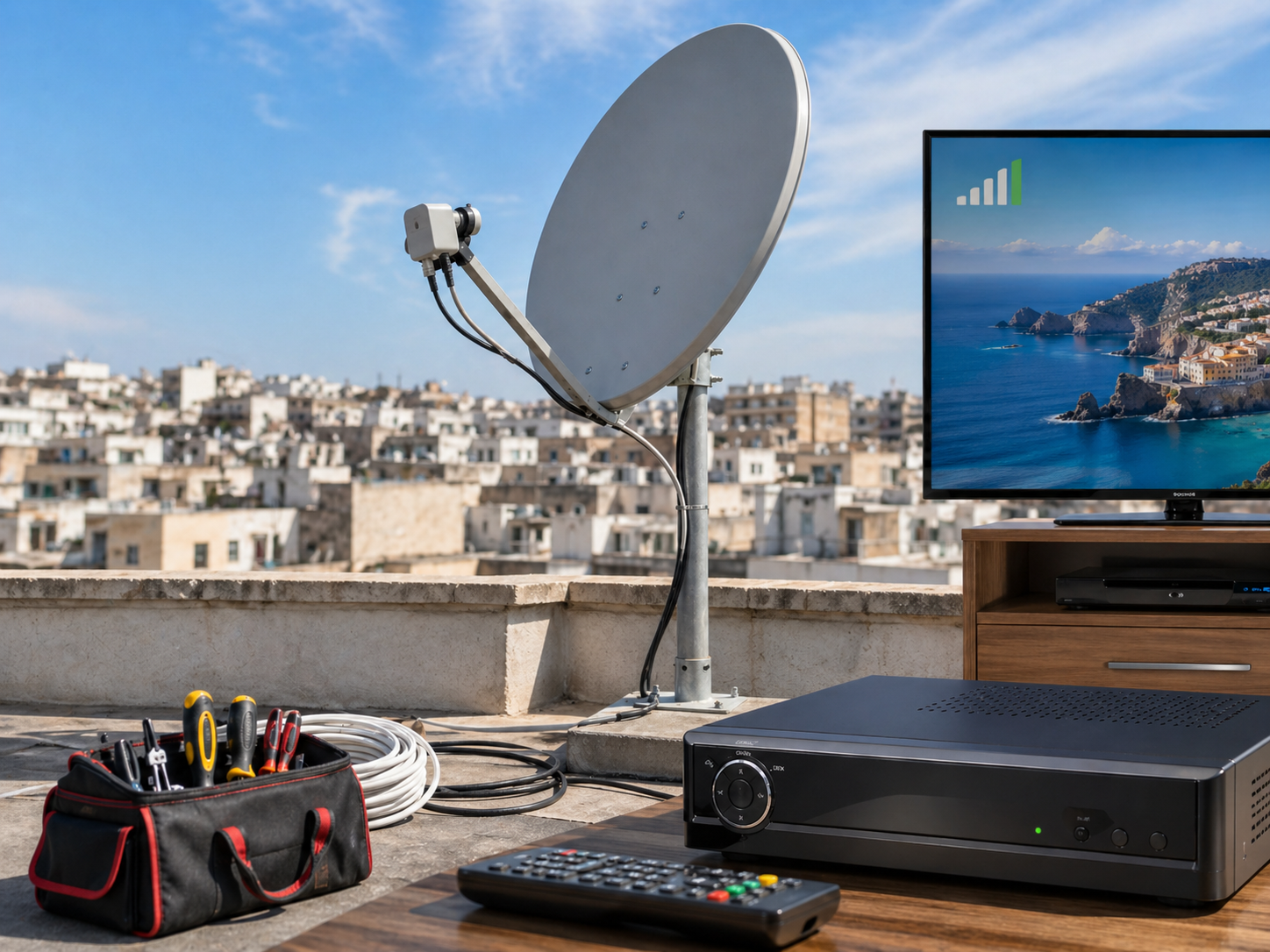 تركيب طبق الدش، تثبيت القاعدة، توجيه القمر، ضبط الإشارة، وتجربة القنوات بعد التركيب.